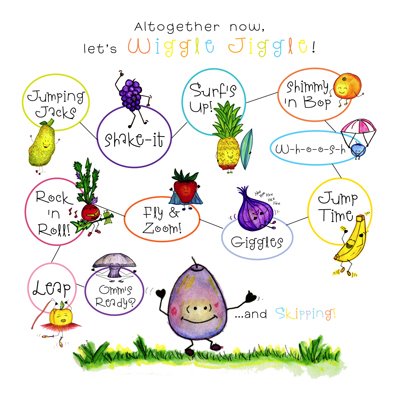 Join Little Lost Grape and all her fruit and veggie friends as they Wiggle and Jiggle their way through the day! From skipping and jumping to giggling and surfing, learn how to Wiggle and Jiggle with the Lunchbox Bunch characters!