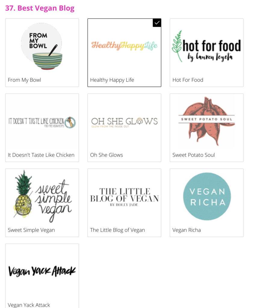 Ok, I'm kicking off this list with my favorite thing. I am so proud and pleased that this blog, Healthy Happy Life is nominated again for Best Vegan Blog.
