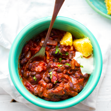 Vegan Chili is one of my most favorite easy, nourishing meals. And this Simple Bean Chili is loaded with hearty + healthy beans! To keep things simple, (and speedy!) minimal ingredients and few veggies are added. (Sure, you can add them if you want to and have more time...)