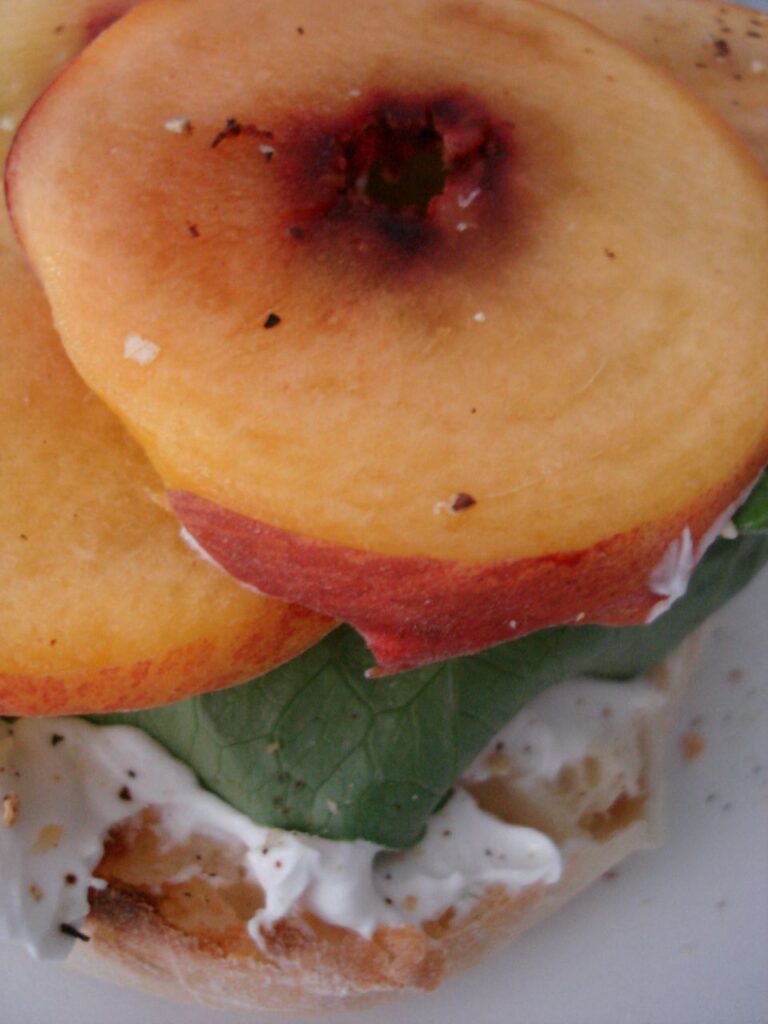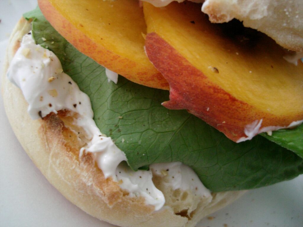 This is a delicious PEACH-CREAM CHEESE-RED ONION-LEMON PEPPER-BIALY SANDWICH! yum right?