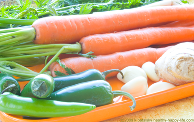 The first recipe is for Classic Vegan Carrot Ginger Soup. Simple flavors that blend together for a spectacular burst of zing! in your mouth. Clean carrot flavor and color. Blended smooth, it has a silky texture. And it's a lot easier to make than you'd guess.