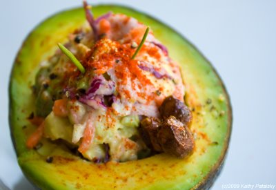 You can really stuff an avocado with all sorts of fillings, but vegan cole slaw is one very delicious option.