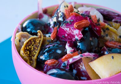 Purple Ingredients. Bold Flavors. This salad has sweet black grapes, succulent purple plums, goji berries, caramelized dried figs, crunchy radicchio, red onion rounds, black sesame seeds and a squeeze of Meyer lemon juice. Flavor is ZING! Then to smooth the flavor, I've added a tablespoon of veganaise or plain soy yogurt. Click ahead for the recipe and more photos ......