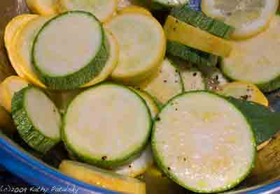 Put sliced squash, garlic, lemon juice, bay leaf, thyme, 2 lemon slices and 2 tablespoon olive oil in a large bowl to marinate. Add a few grinds of fresh pepper and coarse sea salt. Mix well, let sit for ten minutes.