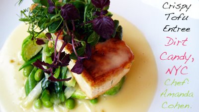 Dirt Candy is the new East Village, NYC vegetarian (vegan-friendly) restaurant from Chef Amanda Cohen. At Dirt Candy, it's all about the veggies. From a bright green spinach soup with smoked tofu dumplings and zing-worthy lemon confit - to a cheerful orange plate of really carrot-y risotto. Chef Cohen pays homage to the delicious things that come out of the ground- the "Dirt candy".