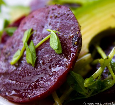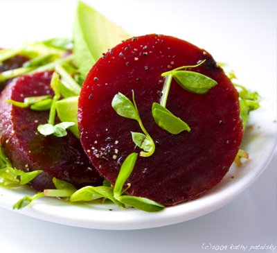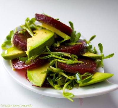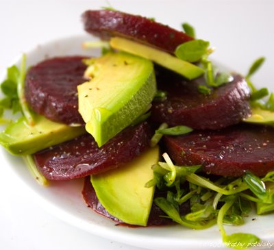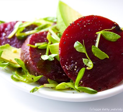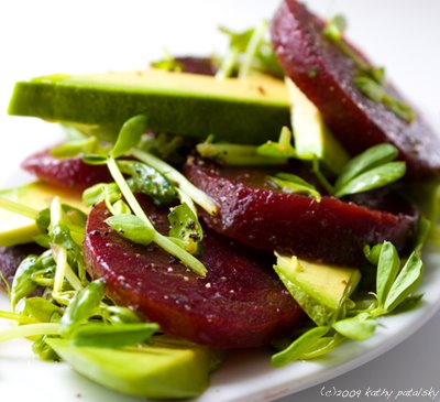 Super simple salad recipe. Sensational flavors! This salad combines sweet baby beets, ripe tender avocados, zesty lemon juice and the trendy spring ingredient green pea shoots (Jean Georges uses pea shoots at his NYC restaurant Jean Georges - see chef trends). Click ahead to find out what a pea shoot is, and get my simple recipe...