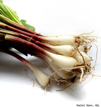 What: In the leek family. Looks like a cross between a scallion and a leek. Floppy bright green tops, white bulb bottom.