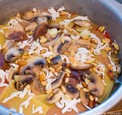 Atop the last layer of cheese, add the mushroom mix. Spread it evenly over the pasta.