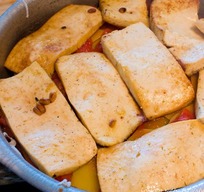 Next, add a thick layer of tofu. Pack them in tightly.