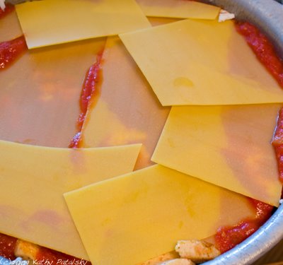 Then lay one layer of no-boil pasta strips on top of sauce.