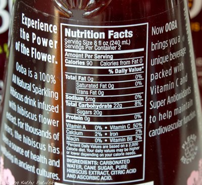 Label Check: 90 calories in 8 ounces. Not bad at all for such a sweet carbonated clear beverage. It's high in Vitamin C and hibiscus has been known to have other heart-healthy benefits according to the Ooba website. Sweetened with can sugar. Simple ingredients. No chemicals.