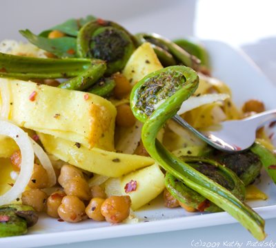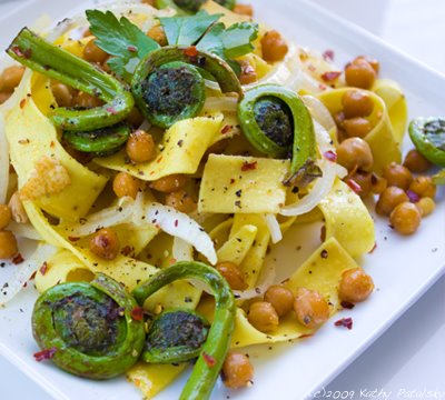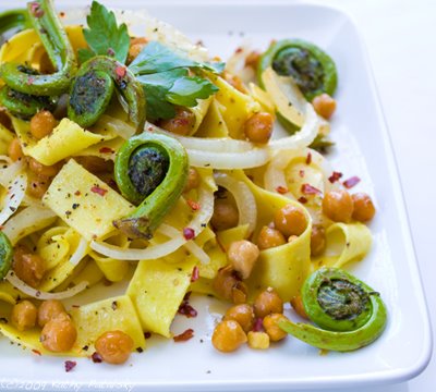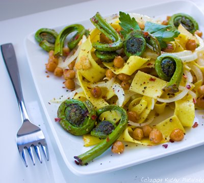 Spicy Sweet Fiddlehead Chickpea Pasta