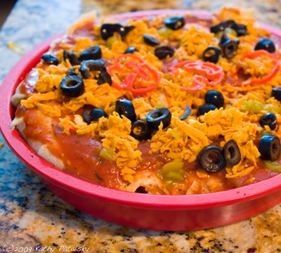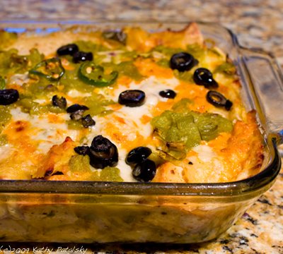 Place in a 350 degree oven for 35 minutes. Then uncover enchilada's and broil on high for an additional 5 minutes to brown and bubble the cheese top.