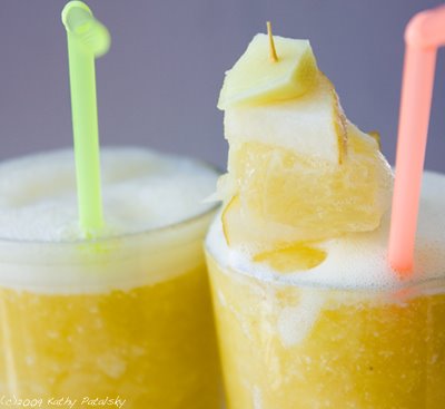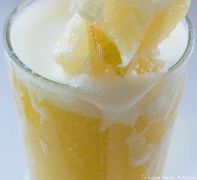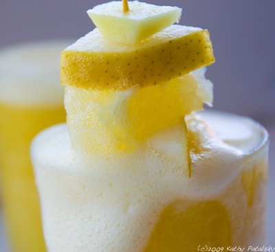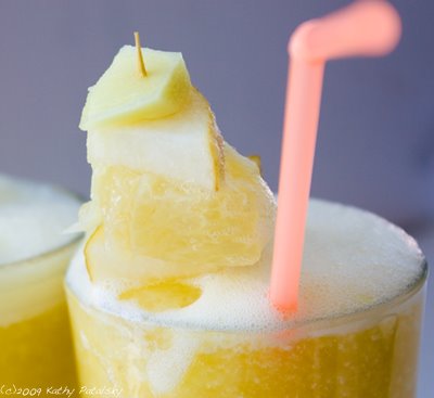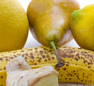 Yellow Fruity Frothy. My ingredients: tart white grapefruit, zingy lemon, sweet bosc pear, spicy ginger and a creamy ripe banana. But the secret to making a frothy is not just in what you put in it, but how you make it...