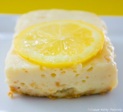 Take your last spoonful of lemon juice and gently splatter the bars with a few random drops of juice-creating nice lemon hole in the top.