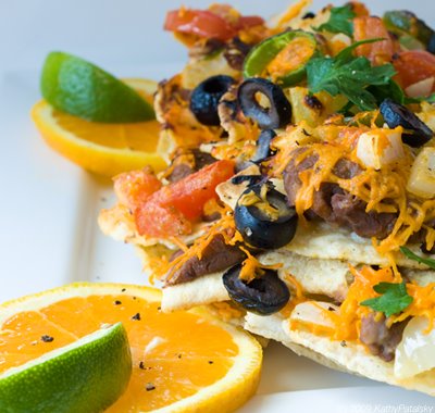 Lift Your Nacho Ban. If you are a healthy eating devotee, you've probably pushed the party, ballpark, snack-worthy food Nachos out of your culinary spectrum. But hold your jalapenos! Nachos aren't all bad! The beans and spicy veggies give this dish good-for-you potential. Improve the chips, add a lot more of the healthy veggies and upgrade the cheese to a vegan version and you are in nacho business! FYI, vegan cheese has 5.5g less saturated fat per ounce than traditional cheese! Discover my recipe for fast, friendly, fun and furiously delicious Vegan Nachos.