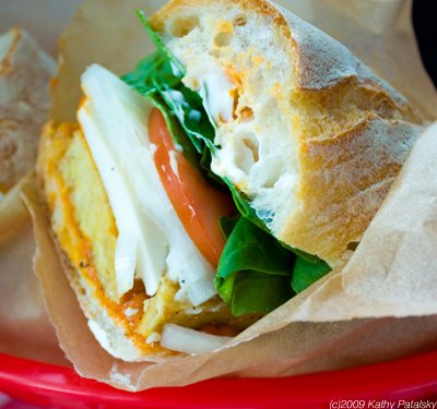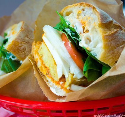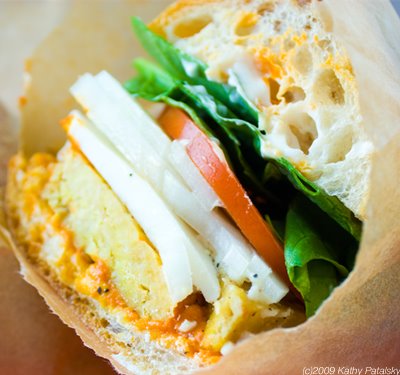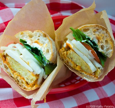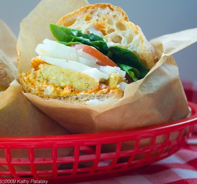 Mix ½ tablespoon vegenaise with paprika, to get a red mayo spread.