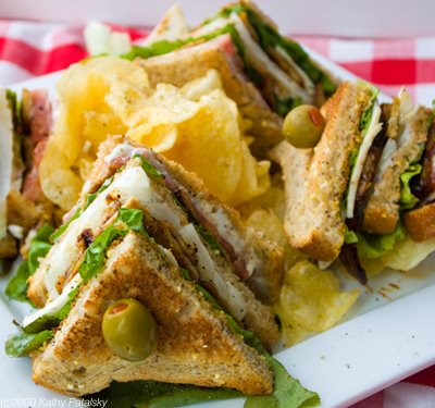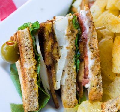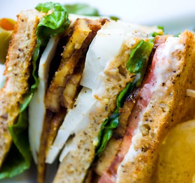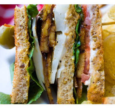The classic Club Sandwich is the king of house made sandwiches. It turns soft poppy seeded loaf bread into a triple decker feast suitable for everyone from poker players and little league teams to ballerinas and poolside bathing beauties. Elegant yet dangerously filling. Dainty yet monster sized. And now there's a healthier recipe to enjoy this classic lunchtime, picnic plate. Here's the recipe for my Healthier Club Sandwich with tempeh bacon. And yes, it's built for two...