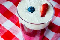 1. Red, White and Blueberry Smoothie: Raspberries, fresh strawberries, acai juice, soy milk, fresh blueberries, coconut banana cream on top. Vegan.