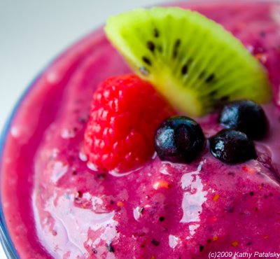 What a looker this all-organic, bright purple smoothie is! It's dotted with tiny raspberry seeds and has a dark purple glow. The fresh kiwi is sweet and zing-y! The soy milk provides a protein-rich creaminess and the acai does the same. There is even antioxidant-rich blueberries and a dab of zesty ginger blended in. This smoothie is awesome!