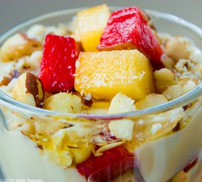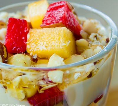Granola Fatigue. I'm really bored by granola in my yogurt parfaits. I'm not a huge fan of granola cereal, so why mush it in my yogurt. You may feel differently, but give this recipe a try and see if you go back to grains. I find that simple chopped nuts add all the crunch I need to get me through the yummy layers. Dry granola just makes me thirsty! Granola free parfaits are the answer to a hydrating yet satisfying yogurt-based breakfast.