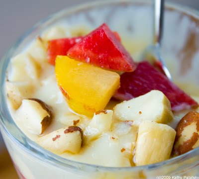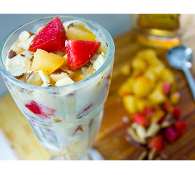 7) Top with a few fresh fruit chunks, nuts and a 1 teaspoon drizzle of maple syrup.