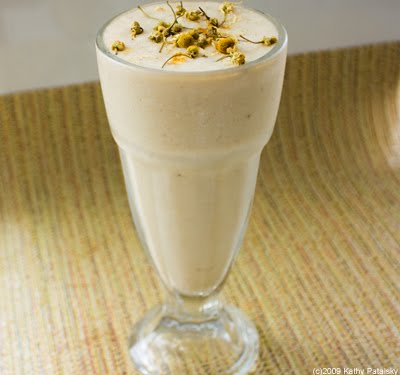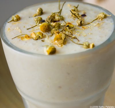 Calming Effects. This smoothie has a plethora of calming ingredients including: chamomile tea and flower garnish, bananas, vanilla, yogurt, coconut water ice cubes, cinnamon, and soy milk. The chamomile really infuses this entire smoothie with a sweet soothing aroma, accented by warm cinnamon and luscious vanilla undertones. The key ingredient in this smoothie is the pile of bananas you will be using. Gentle on the tummy and sweet to your taste buds. Be sure and use ripe bananas. Organic ingredients always preferred. Here's the recipe....