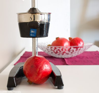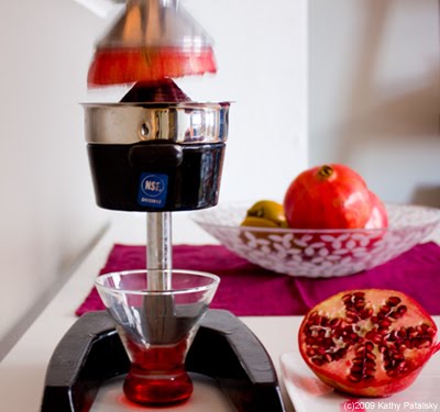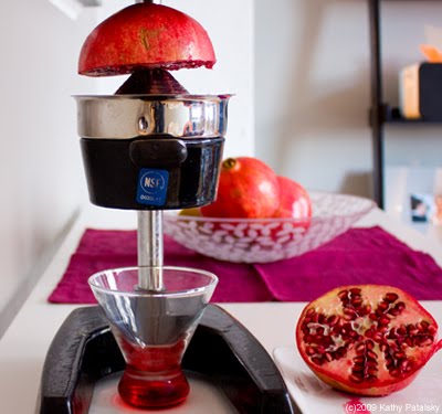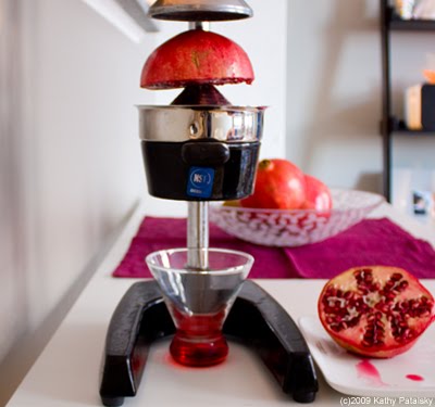 Two Juicer Household. There are some things you love so much, you need two of them. Two cars, two computers, two cameras, two televisions, two pairs of slippers. Me, I have two juicers. I love them both, and they are each used for different juicing purposes. Juicer #1 is my SuperAngel, which I use for juicing anything from apples and ginger to pineapple and wheatgrass. However, if I'm going for straight up citrus juice, I go with juicer #2 the Orange X. However, I recently discovered that I could actually 'juice' or 'crush' pomegranates fairly effectively using my Orange X juicer. I had never tasted truly fresh-crushed pomegranate juice before, and it blew me away. I was hooked. I went out and bought four more pomegranates at Whole Foods the next day.