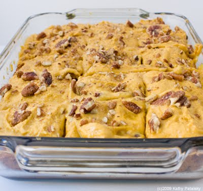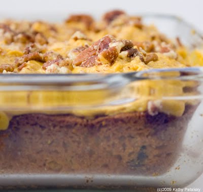 11. When both the cake and frosting have cooled, you can frost the cake. Sprinkle with leftover chopped raw pecans. Slice into squares.