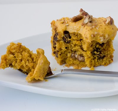 Taste Test. I couldn't wait to try this creation. I had no idea how it would taste, but oh my it smelled divine! The pumpkin puree was fragrant and added a fluffy moisture to the cake. The aromatic combo of cinnamon, chestnuts and vanilla almost knocked me over when I pulled the cake out of the oven. If "sweet fall breeze" had a perfume fragrance, that smell would be it. Hmm, maybe I should brand that. Anyways, back to the taste test. First bite: yum! Super moist pumpkin cake. Those large chewy soft chunks of chestnuts are amazing. I actually wanted more chestnut chunks! (Feel free to add as many as you'd like to your batter.) The speckled bits of chocolate chips were a nice touch, but actually not necessary. You can leave them out for a lower-calorie treat. The chestnuts stood out well all on their own. Yum. The frosting was the perfect accent. It smelled like cinnamon, vanilla and pumpkin. Beautiful orange color. I loved the spice accents in both the frosting and the cake. Don't skimp on those high quality spices.