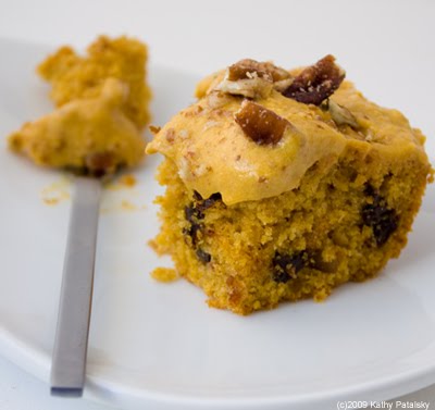 What's in a Name? Blondies or Cake. Hands down, this is a dessert. Aka, treat. But perhaps a treat to be eaten with tea, coffee or chai. At first I wanted to call these 'blondies' aka vanilla brownies, but then I realized that they really bake up light and fluffy like a cake. However, because this recipe has so much 'good stuff' in it (not simply flour and sugar like a traditional 'cake') I wanted to call it a tea cake. But I ended on just plain old 'cake' branding for it. 🙂 And by good stuff in it, I mean whole wheat flour, pumpkin puree, pecans, chestnuts, spices and soy milk. Whatever you call it, it's delish. Oh, and the sweet pumpkin cream frosting certainly sweetened up the 'cake' part of the deal...