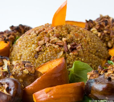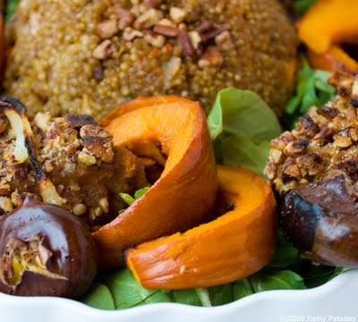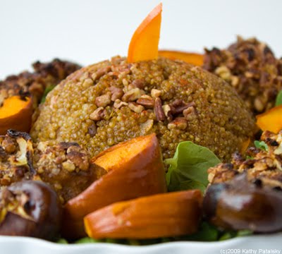 Apple Cider Quinoa. It all started with my idea to boil the grains in a mix of apple cider and veggie broth instead of just broth or water. My idea worked, with some flavorful results. My Thanksgiving-inspired Golden Orchard Quinoa recipe is infused with the flavors of fall, including: fresh organic apple cider, persimmons, pecans, satsuma mandarins and plenty of fall spices. The dish is heartier than most quinoa dishes. It takes on a risotto-esque texture as opposed to a fluffy grain 'side dish' texture. This dish makes an excellent centerpiece grain for my vegan pumpkin platter which also features roasted sugar pumpkin, roasted chestnuts and pumpkin-pecan-crusted tempeh and tofu. More on those recipes in my next post. Get my quinoa recipe...