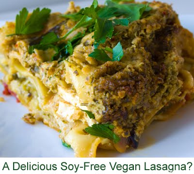 UPDATE: Received this idea from a tweeter: "From @Planithealthier: "I would make a soy-free lasagna with layers of garlic-basil white bean puree. Tahini on top bubbles like melted cheese."