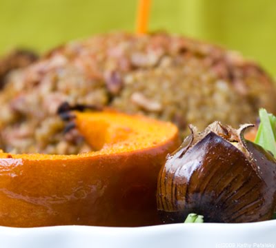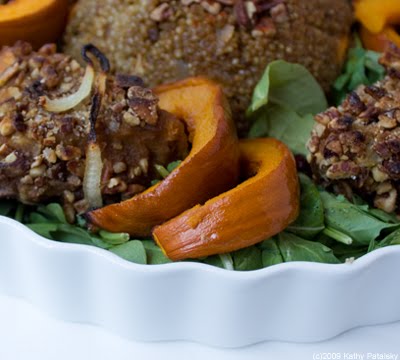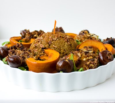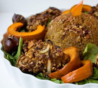 Tired of Tofurky? Try my protein-rich Vegan Pumpkin Platter which features my Pumpkin-Pecan Crusted Tempeh and Pumpkin-Almond Crusted Tofu. Also included on this festive platter: Golden Orchard Quinoa dome, maple roasted sugar pumpkin slivers and salted roasted chestnuts. Here's how to create this centerpiece-worthy platter in five steps...