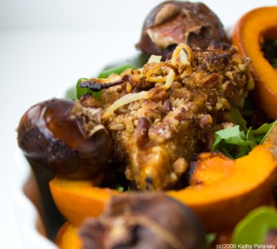 To Make: Clean and halve a sugar pumpkin. Remove seed pulp. Sugar pumpkins are smaller, sweeter, less grainy and lighter in weight than traditional large pumpkins. If you can't find a sugar pumpkin, you can use another sweet winter squash, or add a bit more sugar to a traditional pumpkin. Coat the flesh of each half with a bit of olive oil, maple syrup and brown sugar. Add a dash of sea salt. The oil/sugar mixture should create a nice pool in the center where you scooped out the seeds. This pool will dry out and marinate the flesh during the cooking process. Place the pumpkin on a baking sheet, flesh side up, and transfer to a 400 degree oven to roast until tender. Usually about 30 minutes-depending on size and how 'crowded' your oven may be. Remove the roasted pumpkin from the oven and slice into ½"-¾" thick slivers, place back on baking sheet, re-coat in oil/maple/sugar/salt and place back in oven, under the broiler for an additional 5-7 minutes. When finished, your pumpkin slices should be browned, caramelized, super tender and tasty. You will plate the pumpkin skin-on because it should easily pull away from the tender edible flesh. Set your slices aside to cool a bit before plating.