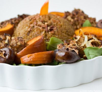 2. Carefully transfer your quinoa dome onto the center of the platter. Garnish your dome with a pointed fuyu persimmon slice.