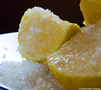 Lemon Confit 2009: Express Lane. Then there are the new-age recipes probably crafted for the younger foodie generation who really can't wait for much of anything. Yeah, OK I can certainly admit to being one of them. Although I will always wait for slow roasted winter squash, mushrooms and veggies. But anyways, it's in our blood to want things fast! We can communicate/text message/tweet with anyone in a blink of an eye, so can't we have the same speed with lemon confit? Maybe. There are several recipes online which boast lemon-confit-results in under an hour. Here is one example from Epicurious.com: