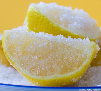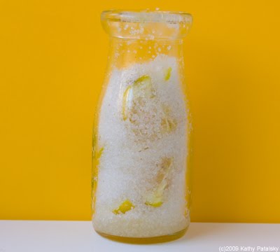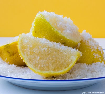 Directions: In a large bowl, mix the salt with the sugar. Toss the lemons with half of the sugar-salt. Pour a small layer of sugar-salt into a clean quart-size jar. Layer the lemons in the jar, covering them with the remaining sugar-salt as you go. Refrigerate the lemons for at least 2 weeks. To use, rinse the lemons well and use the peel only.