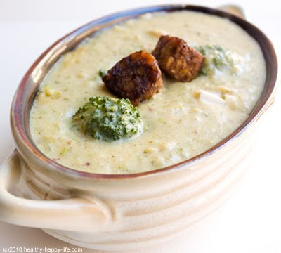 I've been feeling inspired by beautiful bunches of bright green organic broccoli lately. And since it's winter and everyone is better off with something warm in their tummies, I decided to craft a hearty, chunky and incredibly satisfying vegan soup. This recipe is a keeper: Broccoli Jack Soup, with Spicy Maple-Chipotle (Map-oltle) Tempeh Croutons on top. It's perfect for lunch or dinner. Protein, veggies and the perfect amount of vegan cheese. Dive in, it's delicious...