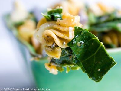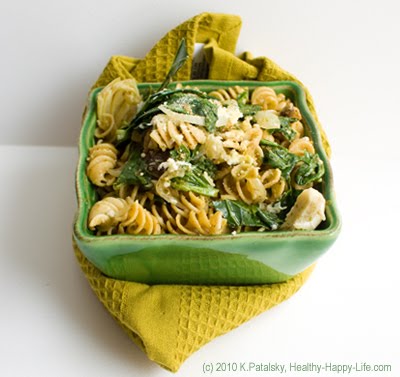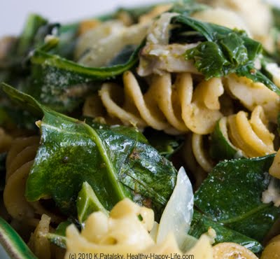 Pasta Wilted Greens. I decided to add three giant handfuls of the greens to my freshly cooked whole wheat pasta. The warm pasta wilted the greens beautifully, making a super flavorful and super healthy dish. Also, eliminating another step in my process: no-cooking the greens separately, fabulous!