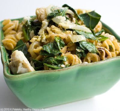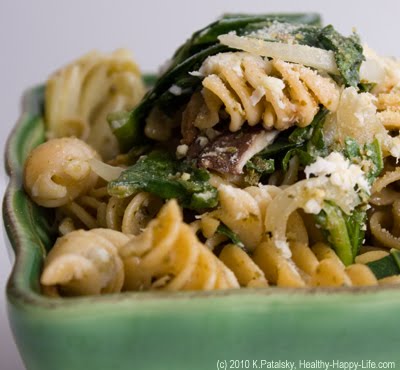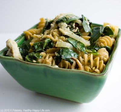 The flavors: garlic, basil pesto, EVOO, sweet onions, marinated artichokes, a few sliced shiitake mushrooms and a huge armful of fresh cut leafy greens. The greens are wilted into silky layers and blended into the tender spirals of whole wheat pasta. A pinch of vegan cheese on top. No basil? No problem! You'll be intrigued to see that this pesto pasta was made without fresh basil - since it can be tricky to always have fresh basil on hand. This is your shortcut recipe answer. Get some green (pasta)...