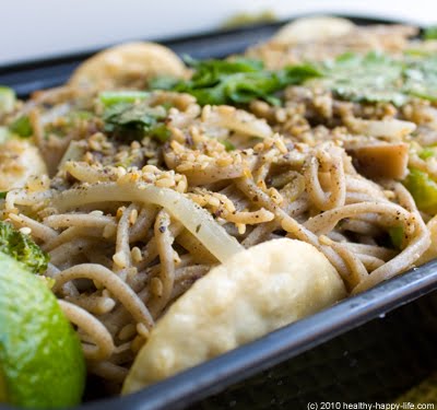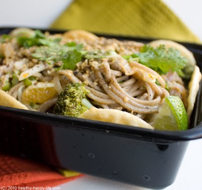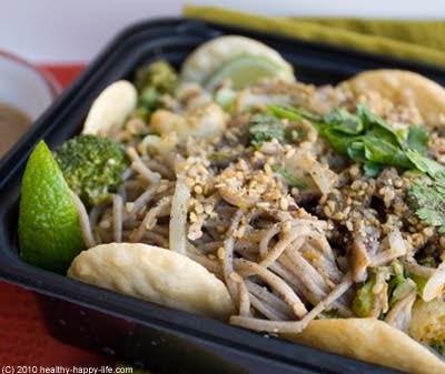 Customers, Taste-Testers and Special Requests. Before I post a new recipe, it is always my family who is on the front lines of taste-testing. Holidays are the best because I get a wide variety of feedback. My favorite is always the opinion of the three-year-old. "Yuck!" or "Yummy! More, more!" are my favorite direct quotes of review. Honesty never fails the little ones. But once in a while I get a special request, and this past week it was from my mom. She loved (and was dying to taste test) my New Year's Eve soba noodle recipe. Lucky mum and dad, I had plans to visit them this week, so I brought them a nice "takeout" style sampling of soba noodles. But I was eager to try a new recipe, so I tried this Pad Thai twist on soba noodles, with a decadent Spicy Peanut sauce on the side. The taste test was met with great approval, thus I will now pass the recipe on to you...