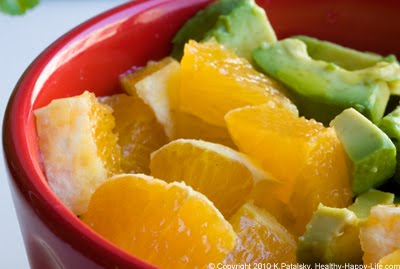 4. Peel your orange and dice. Place in another small bowl. Dice your avocado and put into same bowl as oranges. Toss a bit so orange juice coats avocado. This prevents browning. Black pepper on top, set aside.
