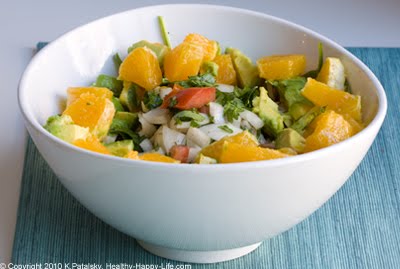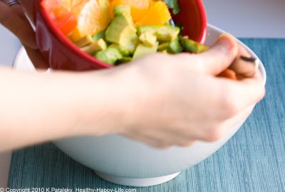 11. Next add the orange/avocado mixture to the edges of the salad bowl - create a border along the sides of avocado and citrus.