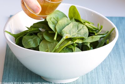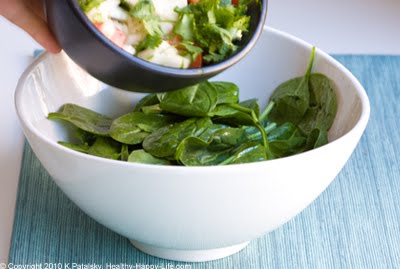 9. Now we can start to craft the layered salad! First, place the baby spinach in your large serving bowl. Mix the greens with ¾ of your dressing. Set aside the remaining dressing for later.