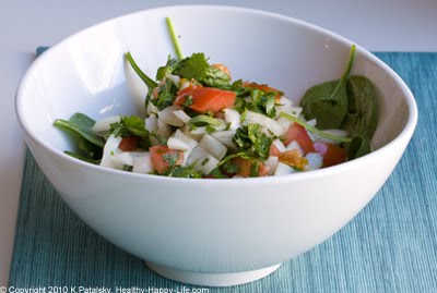 10. Over top the spinach. add the tomato/onion/cilantro mixture.
