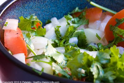 3. Dice you onion and dice your tomato, put both in a small bowl. Finely chop the cilantro and fold into the tomato and onion mixture. Grind fresh black pepper on top. Set aside. Note: If you would like a spicier salad, mix in 1 diced jalapeno and 1 teaspoon chipotle spice to this mixture.