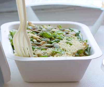 Dry lifeless couscous with a few chunks of one note cauliflower and butternut squash chunks mixed in. Rubbery spring onions. Pepitas on top. No dressing? The website says it comes with dressing. However, they must've forgot mine. But I don't think dressing would save this sandbox of a salad. Super boring. Tasted like I was eating sand. Sorry, that was mean. But I was struck with visions of the desert as I scooped up squeamish couscous with my compostible fork. The Sahara perhaps.