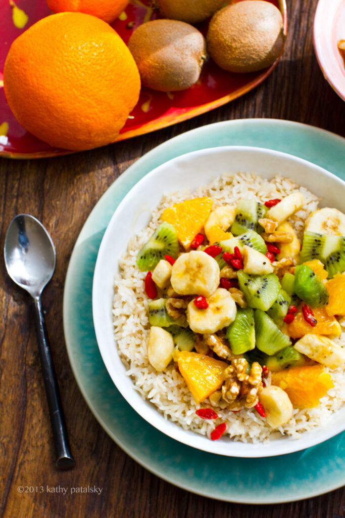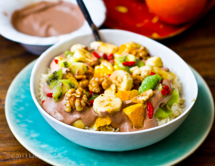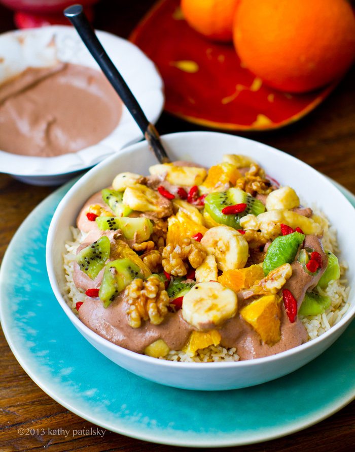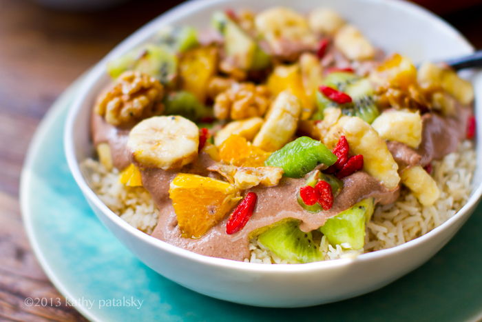 4. Serve! Add the grain base (warm rice) and top with the cacao puree and as much fruit salad as you'd like.
