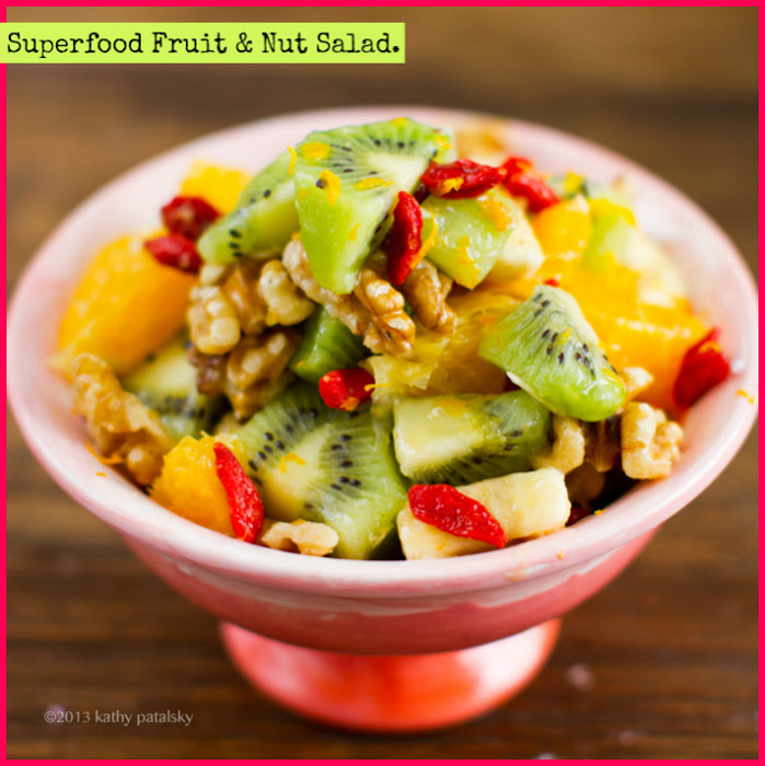 The fruit is bursting with antioxidant bliss. Vitamin C galore. Fiber. Potassium and more. This salad boosts wellness is a variety of ways including immunity-boosting and anti-aging/ free-radical fighting power. Plus all that sweetness provides a natural burst of energy. (And since there are healthy fat nuts in there too, you are slowing down digestion so that your blood sugar doesn't spike and crash.)